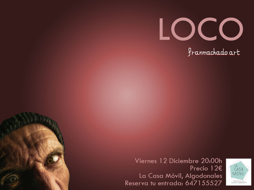 Fran Machado vuelve a La Casa Móvil con una nueva propuesta de improvisación en la que nos trae LOCO, una obra de 60 minutos en un ahora constante. Después del éxito de Gigi en este espacio el año pasado, el sábado 12 de Diciembre Fran Machado vuelve a La Casa Móvil con su nueva propuesta “Loco”, una oportunidad única para disfrutar de este último estreno en la intimidad de nuestra casa.